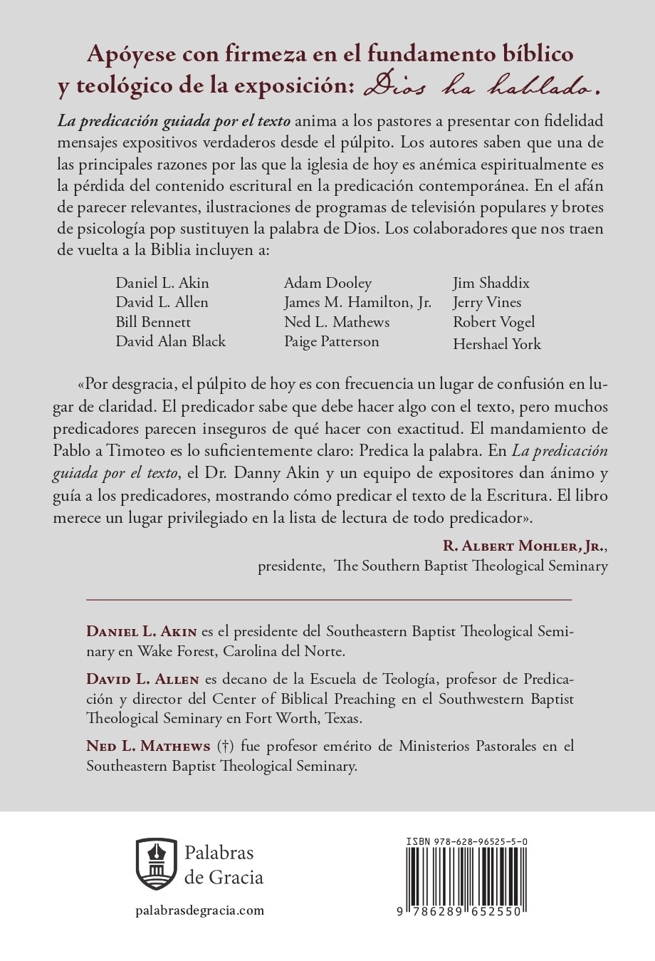 La predicación guiada por el texto anima a los pastores a presentar con fidelidad mensajes expositivos verdaderos desde el púlpito. Los autores saben que una de las principales razones por las que la iglesia de hoy es anémica espiritualmente es la pérdida del contenido escritural en la predicación contemporánea. En el afán de parecer relevantes, ilustraciones de programas de televisión populares y brotes de psicología pop sustituyen la palabra de Dios. Los colaboradores que nos traen de vuelta a la Biblia incluyen a: